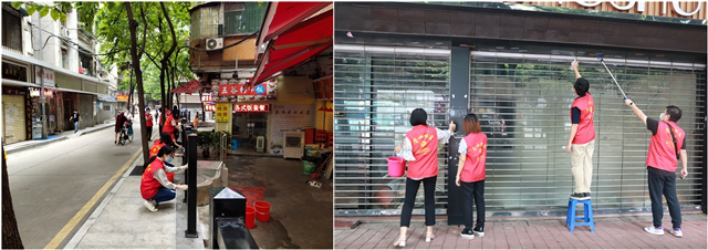 图1-6.集团部室党支部、餐管党总支、营销公司党支部参与清扫社区、街道卫生服务活动