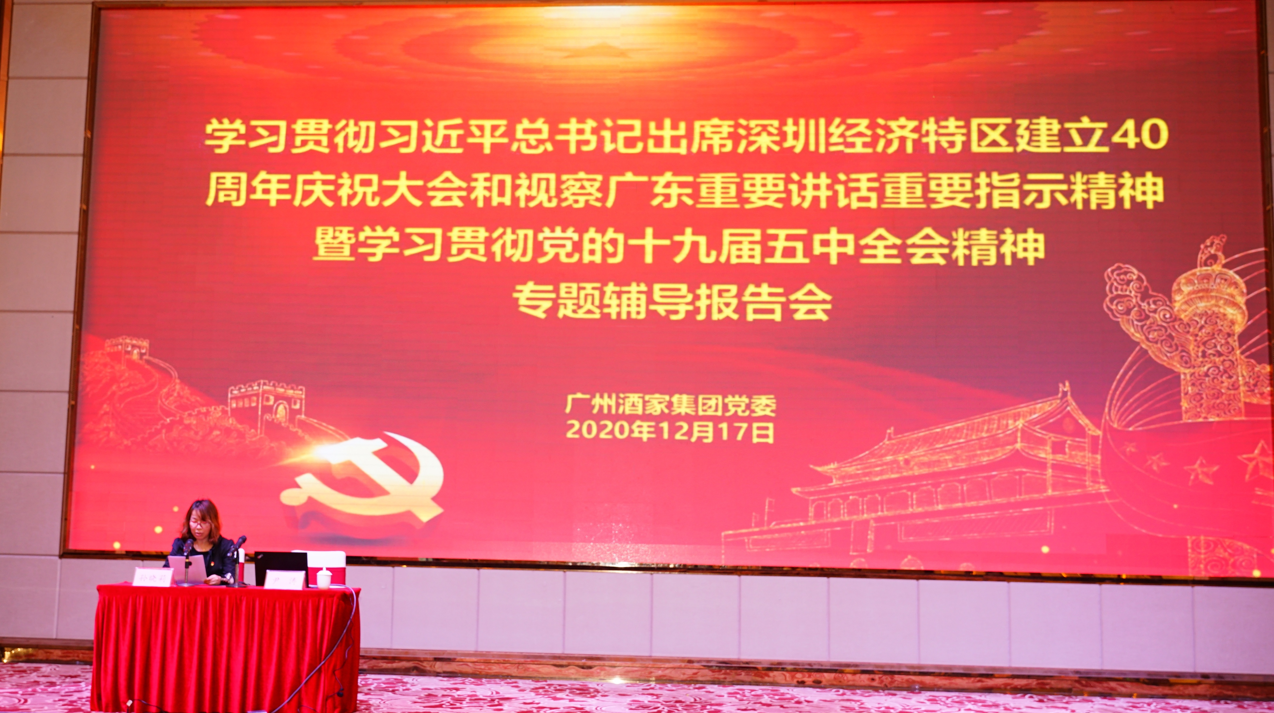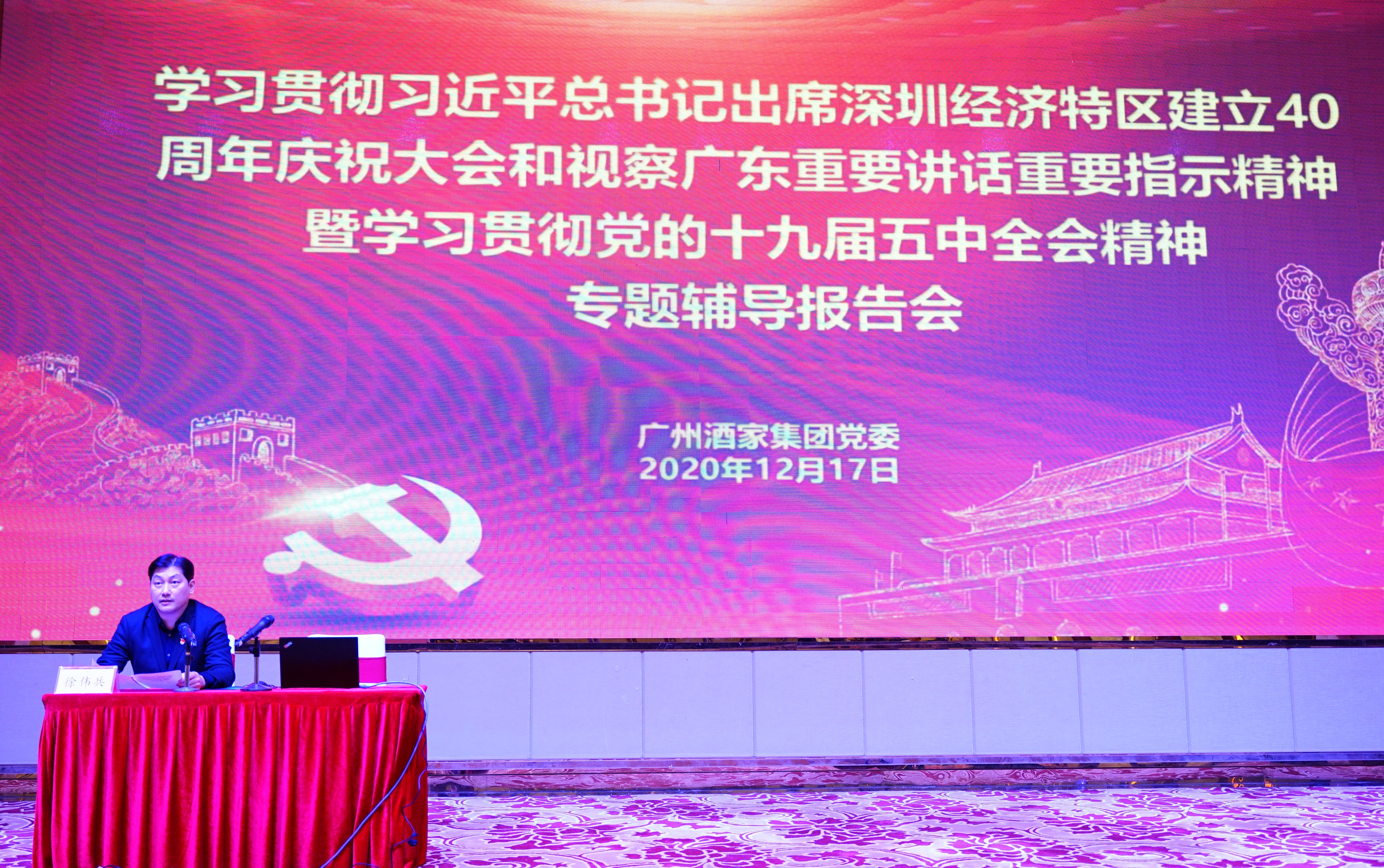 党委举办学习贯彻习近平总书记出席深圳经济特区建立40周年庆祝大会和视察广东重要讲话重要指示精神暨党的十九届五中全会精神专题学习辅导报告会,邀请市委宣讲团成员、市社科院副院长尹涛,作以“树立新发展理念,构建新发展格局推动新时代广州经济高质量发展”为主题的专题辅导报告。集团党委副书记孙晓莉主持会议。集团班子成员、集团中层以上管理人员、全体党员共计230余人参加会议。