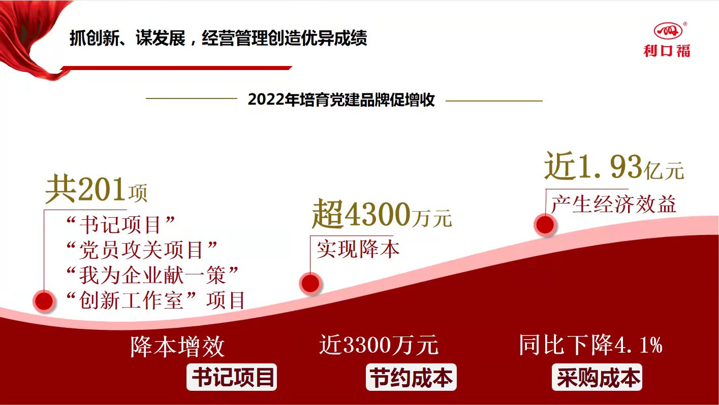 公司党委充分发挥“把方向、管大局、保落实”作用,围绕“高位推进”“靶向甄选”“书记领跑”“闭环管理”4要素发力,深耕细作“书记项目”,梳理推出“党建引领促新品上市创效益”“智能制造促提质增效”“馅料车间节水工程”等“书记项目”41项,其中“降本增效”书记项目,通过精益管理为企业降低成本近3300万元。围绕强基固本、生产组织、管理创新等8种类型,稳步推进“党员攻关项目”,建立“月度督查、季度推进、年度总结”工作机制,成功实施《肥肉丁自动清洗系统》《腊肠自动配重工艺线》等项目,先后荣获广东省职工“五小”创新成果竞赛“创新成果奖”“羊城工匠杯”职工“五小”竞赛“优胜奖”。近年来,共完成建档入库超600个项目,创造经济效益超3.4亿元,真正意义上实现党建工作与生产经营互融共进。