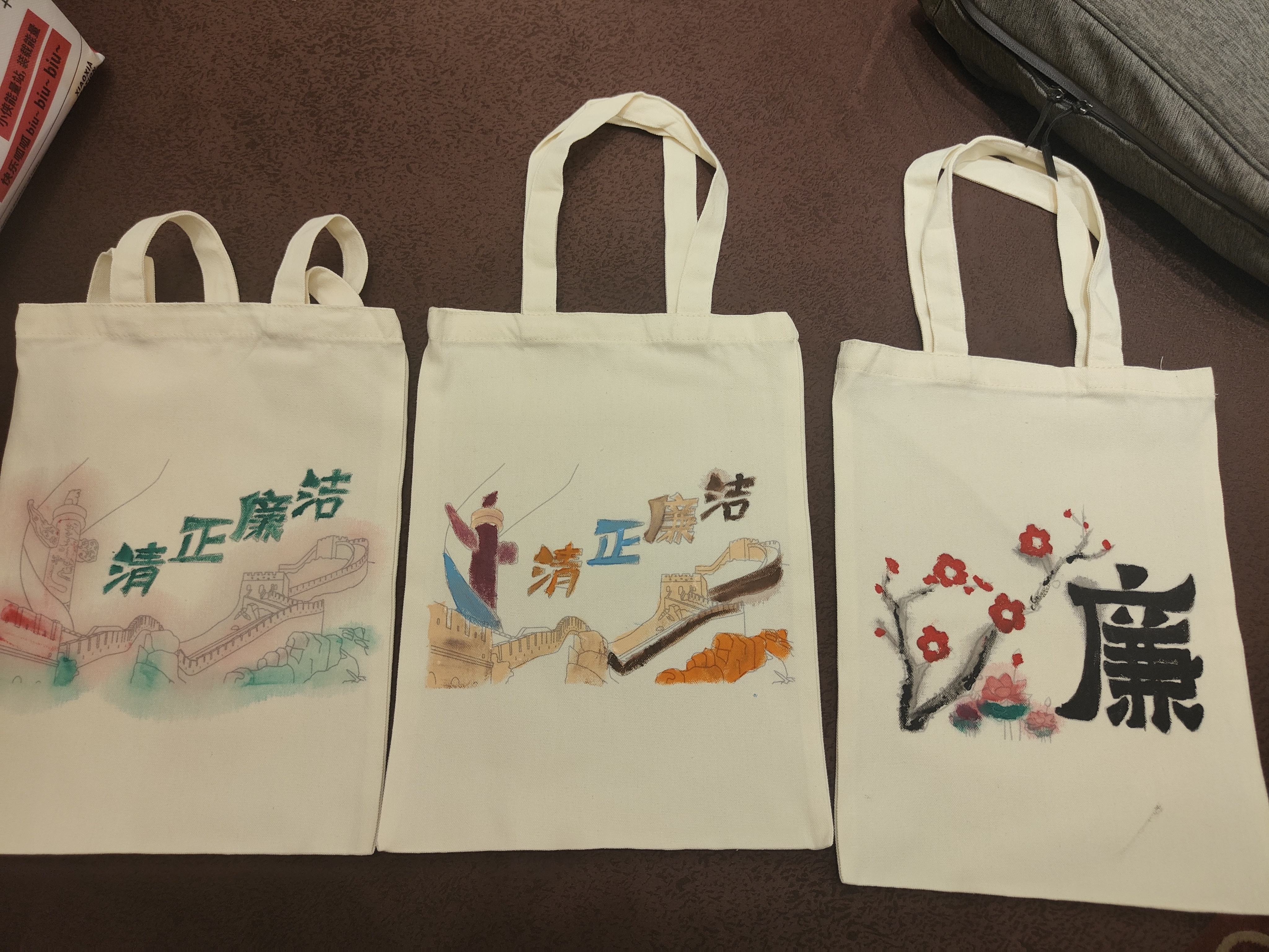 为弘扬中华民族传统文化,餐管公司第一党支部组织开展“巧手画廉”活动。活动现场,大家聚精会神,拿起手中的画笔,在白色的帆布袋上临摹莲花、梅花…….,随着朵朵莲花、梅花在笔下盛开,一幅幅精美的廉洁作品也呈现在大家的眼前。通过手工制作的方式,将廉洁文化融入工作,融入生活,加深对廉洁文化的理解。