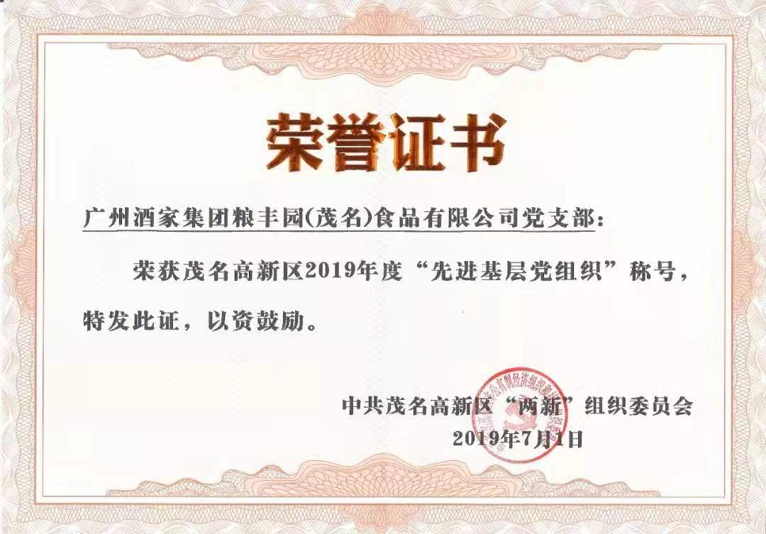 2019年,集团党委召开党员大会,选举产生新一届党委、纪委,并结合企业发展实际,不断优化基层组织架构和党员结构,注重加强在党建薄弱领域和重点群体中发展党员力度;先后选派7名优秀年轻干部担任新支部、新项目的基层党组织负责人,组织党支部书记专题培训班等各类党建业务培训7次,坚持“先培训后上岗”;印发《党支部书记抓基层党建述职评议考核工作方案》,对基层党支部书记开展年度党建工作考核,属下餐管第一党支部荣获“广州市先进党组织”称号,粮丰园党支部获茂名高新区“先进基层党组织”称号。