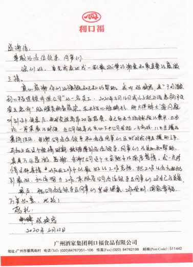 图2.员工张某给公司和同事的感谢信