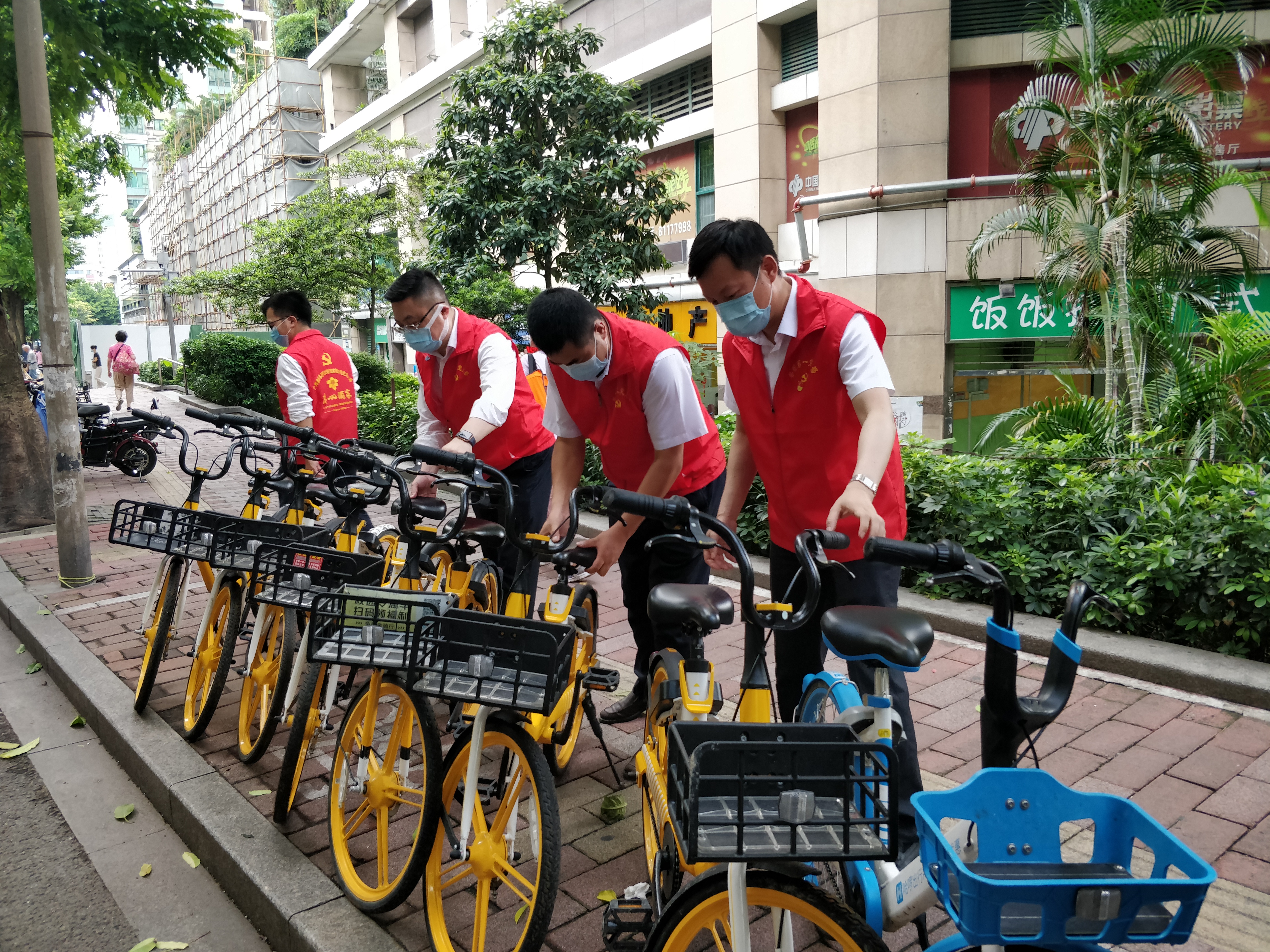 图7.餐管党总支党员干部将共享单车摆放整齐还原街容街貌
