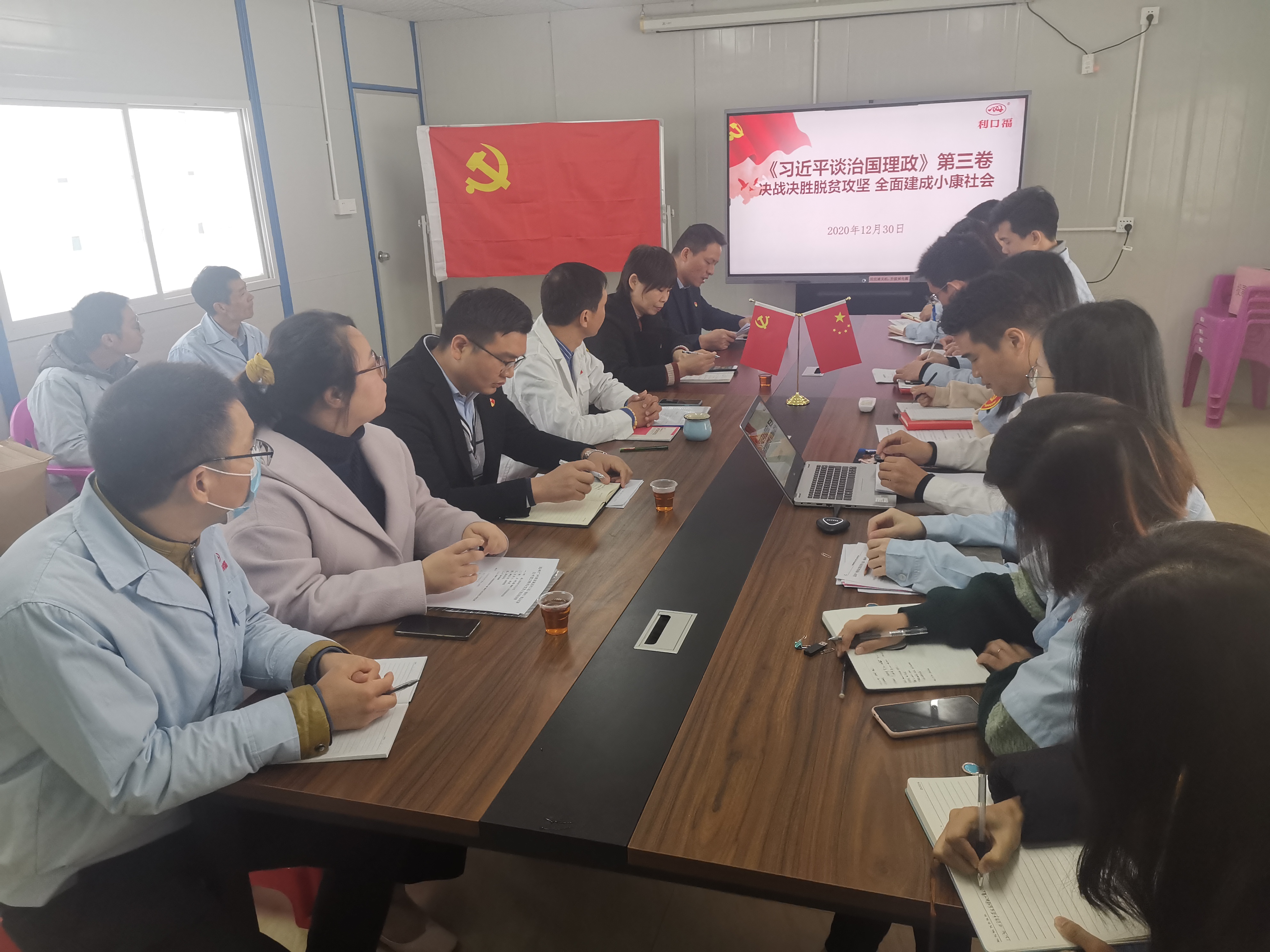 会上,胡罗松同志领学《习近平谈治国理政》第三卷脱贫攻坚专题,传达利口福公司党总支对梅州项目组的要求:一是要做到思想不松懈,坚持“输血”与“造血”并举,全力确保贫困群众持续增收、稳定脱贫;二是要坚持标准不降低,聚焦目标,精准落细各项扶贫措施,使得脱贫工作落地见效;三是要强化项目的施工安全、生产安全工作,在保证安全的情况下,真抓实干,确保顺利投产。
