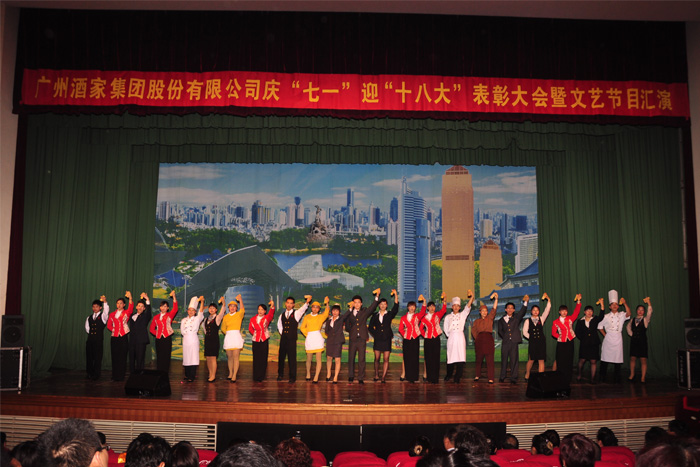 股份有限公司在广州平安戏院隆重举行了庆“七一”、迎“十八大”表彰大会暨文艺节目汇演。并对2011—2012年度涌现出的党内先进基层党组织、优秀共产党员和优秀党务工作者进行了表彰。会议由党委副书记楚延林同志主持,广州市派驻市国资委纪委书记陈海如同志、广州市委组织部林振华科长、广州市委宣传部陈立春科长等上级领导以及我司全体党员、职工代表共600多人出席了大会活动。
