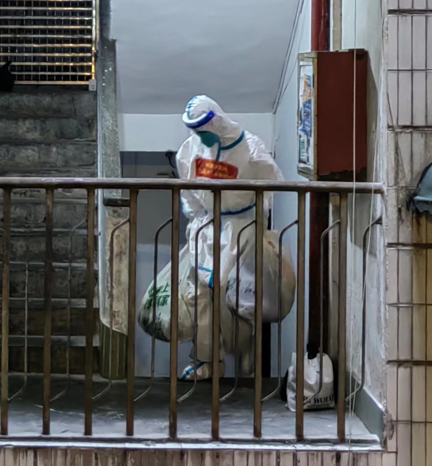 面对陌生复杂的环境和极易感染的风险,赖金海积极配合队长落实好每一项工作。“请各位居民马上下楼做核酸”他化身为“大白”,手拿喇叭穿梭在各个楼栋之间,不断提醒居民出门做核酸。为确保做到“不少一栋、不漏一户、不缺一人”,他奔走于9栋居民楼不同楼层。有些楼层高达七、八层,他挨家挨户敲门确认,织牢疫情防控群防屏障。