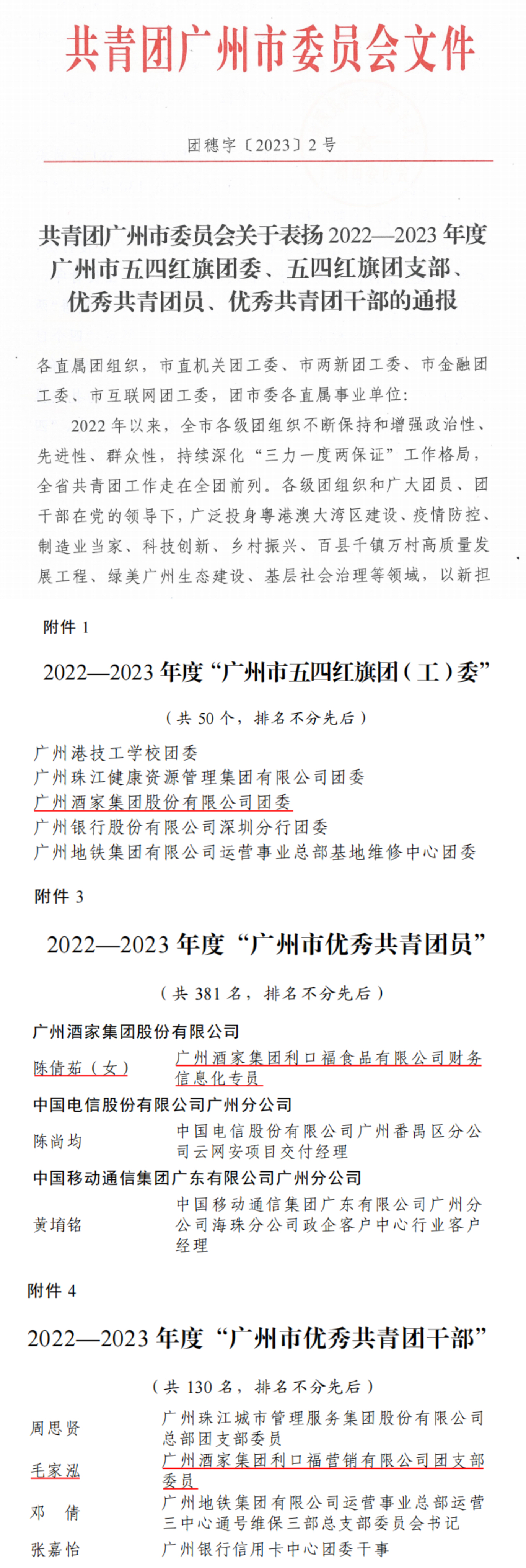近日,共青团广州市委员会印发了《关于表扬2022-2023年度广州市五四红旗团委、五四红旗团支部、优秀共青团员、优秀共青团干部的通报》,对过去一年表现突出的先进集体和先进个人进行表彰。瓜子tv 1个集体和2名个人榜上有名,其中,瓜子tv 团委荣获“广州市五四红旗团委”称号,陈倩茹荣获“广州市优秀共青团员”称号,毛家泓荣获“广州市优秀共青团干部”称号。此外,团市委对瓜子tv 2022年团组织领导班子履职情况给予了“优秀”的等次评价。