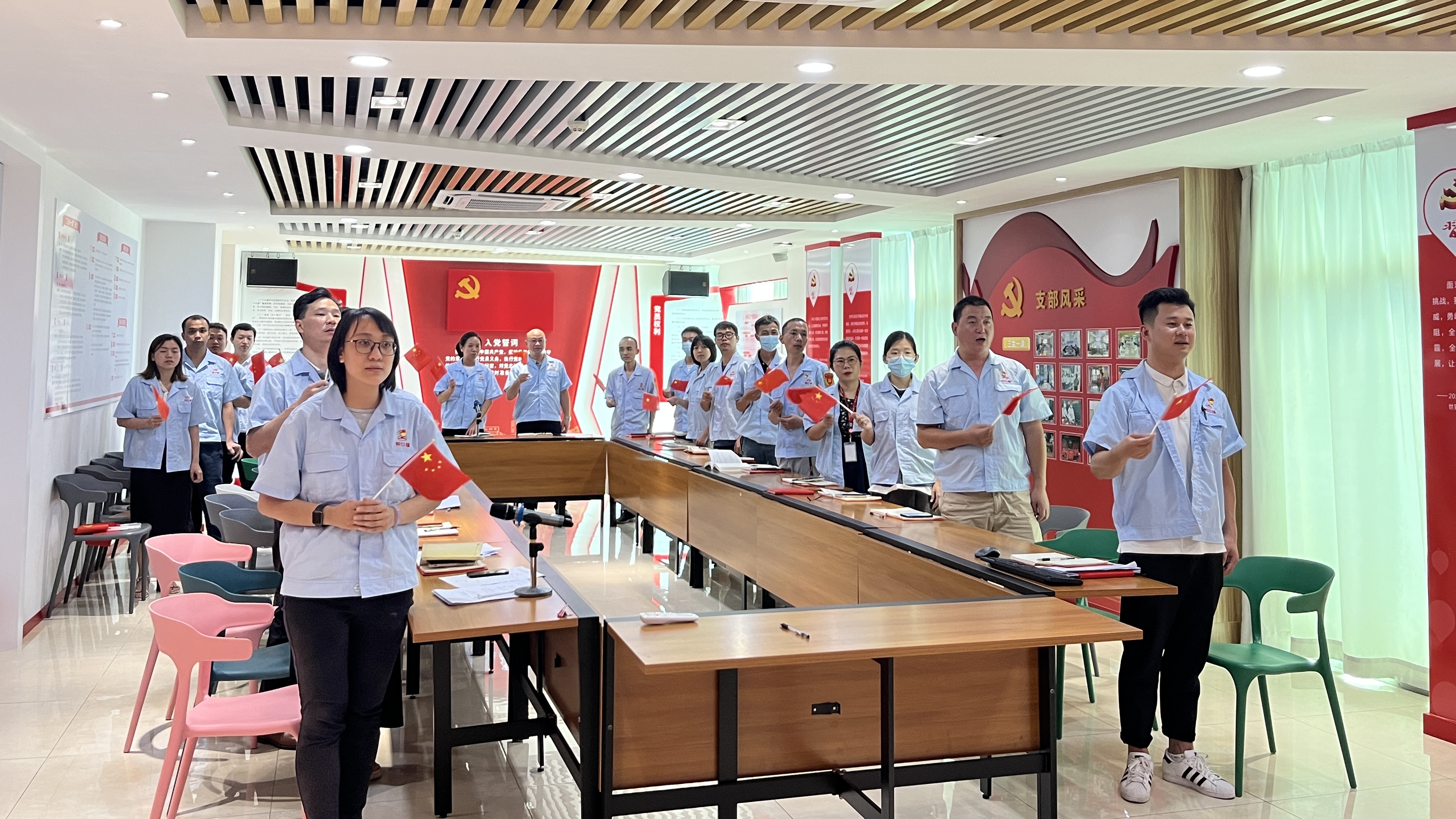 歌曲是时代的心声,一首红歌诉说一段历史。全体党员气势昂扬、齐声高唱《没有共产党就没有新中国》,用歌声抒发自己内心深处对党和祖国的热爱,颂扬中华民族伟大复兴的奋斗历程。