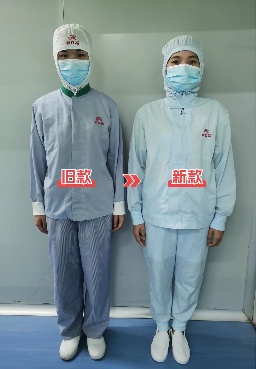利口福公司为速冻生产部职工换发了新款工作服。针对职工反馈的头发易外露、细节隔离性差、透气性不良等问题,公司对工作服款式进行了优化设计,特别对帽子、袖子、门襟等细节做了调整,增加了连衣帽、面部抽拉绑带等设计,同时选用了新式透气亲肤面料,提升了舒适度。