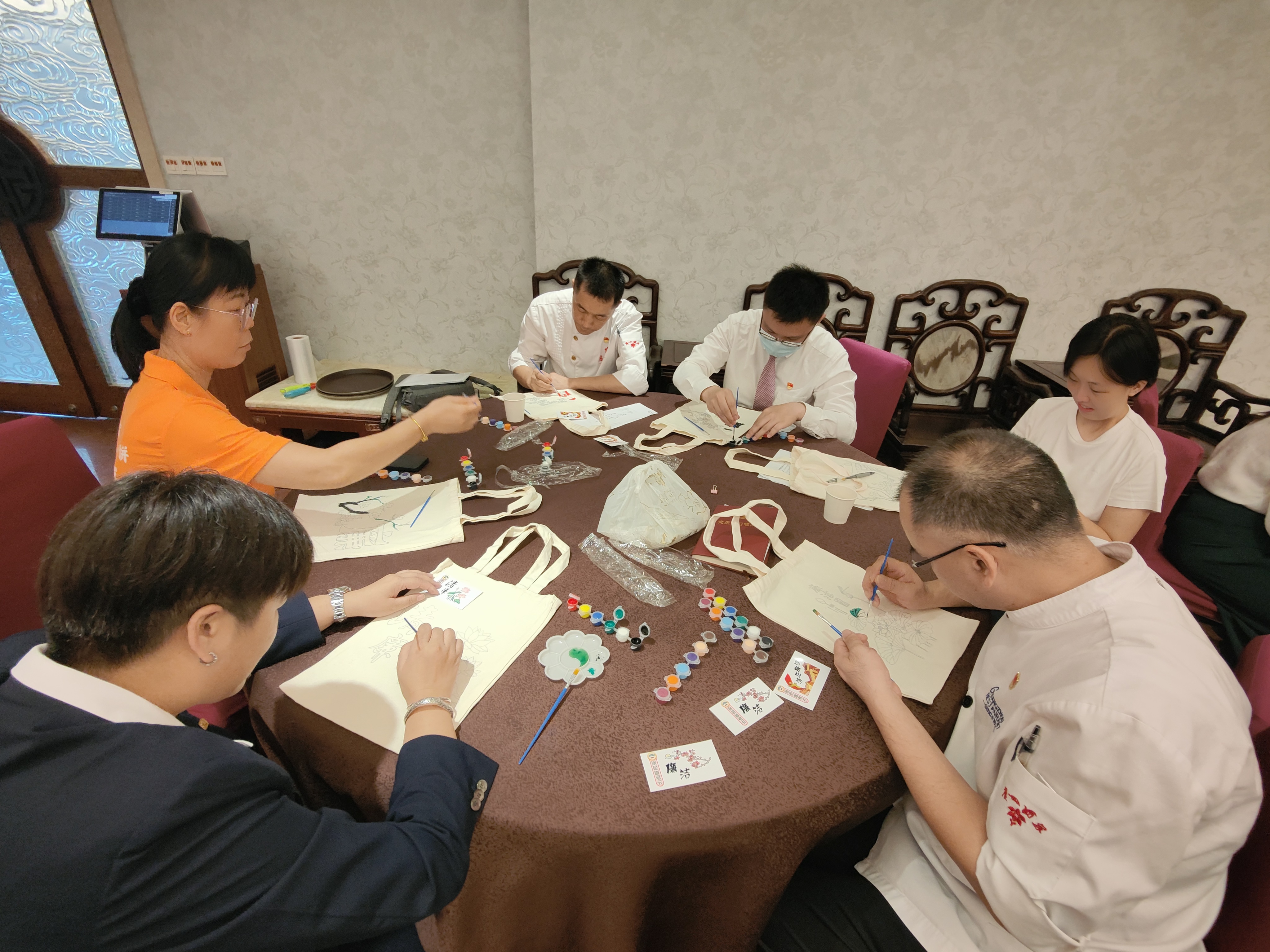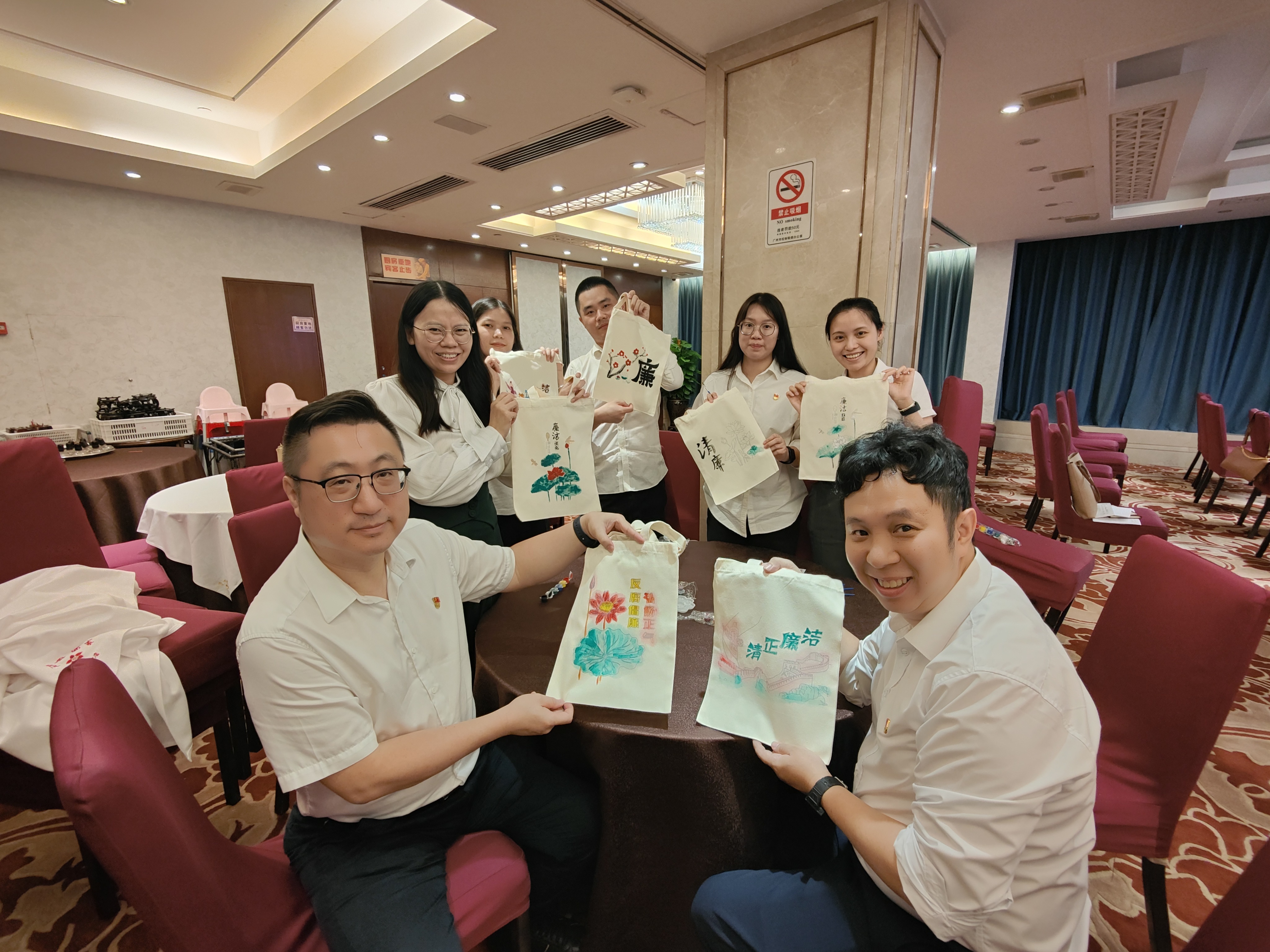 为弘扬中华民族传统文化,餐管公司第一党支部组织开展“巧手画廉”活动。活动现场,大家聚精会神,拿起手中的画笔,在白色的帆布袋上临摹莲花、梅花…….,随着朵朵莲花、梅花在笔下盛开,一幅幅精美的廉洁作品也呈现在大家的眼前。通过手工制作的方式,将廉洁文化融入工作,融入生活,加深对廉洁文化的理解。