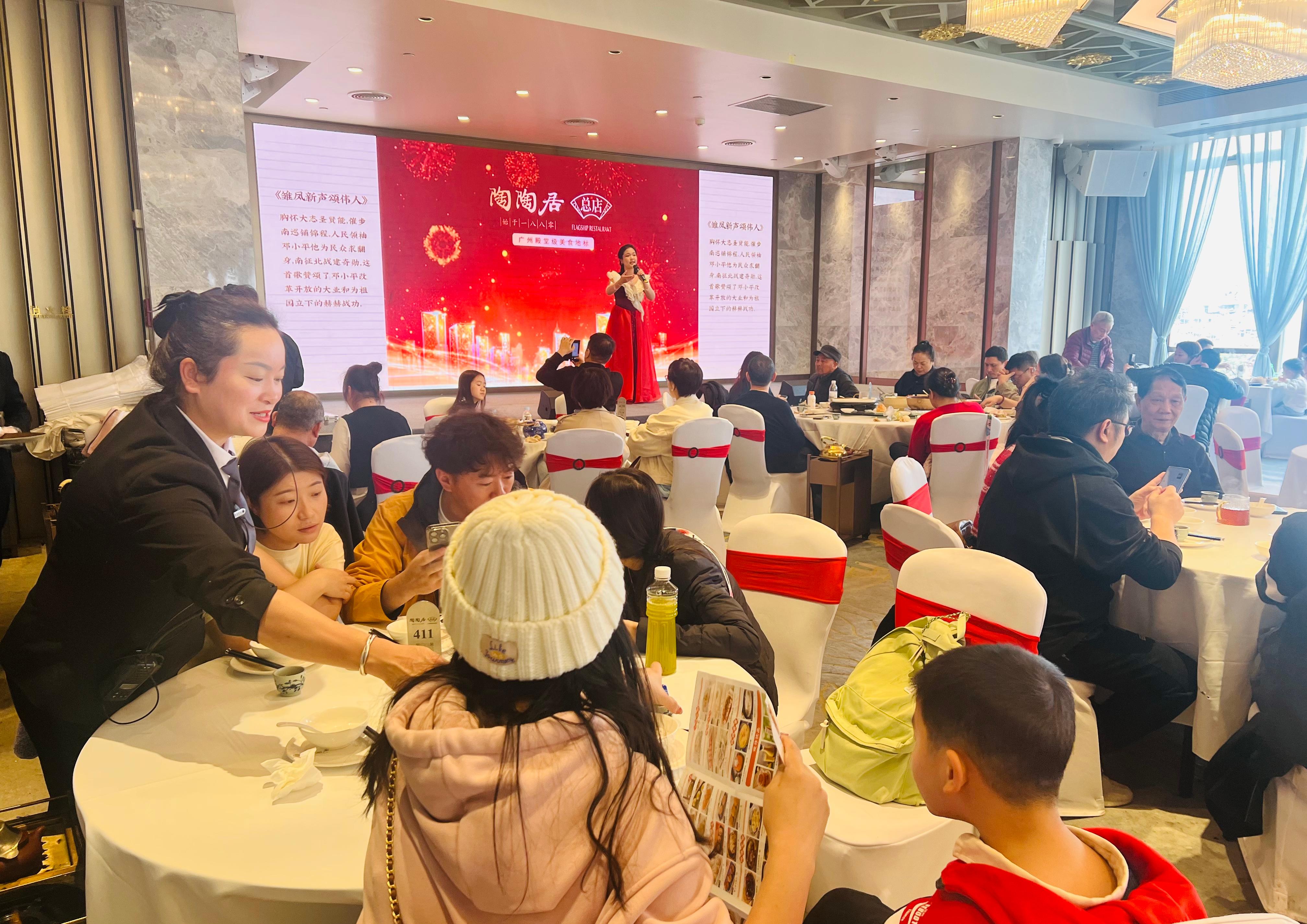春节期间,舌尖上的美味成为节日焦点。瓜子tv 、陶陶居等餐饮门店“春节档”从早到晚客流不断,餐饮消费热气腾腾,助推“年经济”活力满满。为增添新年喜庆氛围,各餐饮店精心推出多款特色年夜饭宴席及新春团圆外带套餐,上新“贺岁金沙醒狮”“五彩姜汁年糕”“金玉满堂盆菜”等新春限定“意头菜”,开展赠挥春送祝福、财神巡游送红包及消费抽盲盒等特色迎春接福活动。陶陶居第十甫路总店更推出粤剧迎春连唱活动,现场演绎粤剧贺岁曲目,巧妙融合粤菜餐饮与传统文化打造餐饮消费新场景。春节期间餐饮店年夜饭预订量过千桌,客流量与营业收入均实现同比双位数增长。