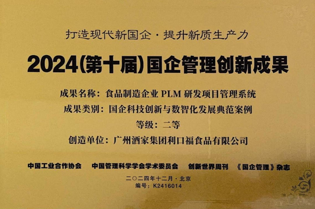 利口福公司坚持以数智转型引领现代化产业体系建设,积极引入先进智能化设备和信息化管理系统,推动过百项智能制造与技术改造项目建设落地,优化升级产品全生命周期管理系统等数字化平台,加快打造“智慧工厂”。其中,研发项目管理平台(PLM)获评“2024(第十届)国企管理创新成果”二等奖。